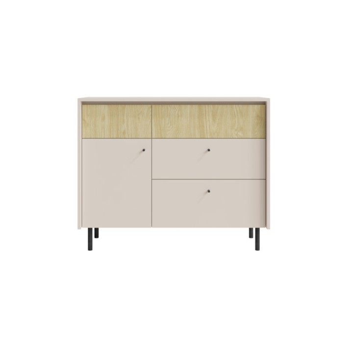 The Malta ML7 chest of drawers by Meblar features a warm sandy beige finish complemented by a subtle oak accent on the upper parts of the fronts. With its compact dimensions – 85 cm high, 104 cm wide, and 42 cm deep – this piece easily fits into various interiors, from the living room and bedroom to the hallway or home office.