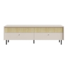 Two drawers positioned just below the top in a warm oak tone create a distinct contrast with the rest of the unit, accentuating the upper section and adding a natural touch. Below them are two symmetrical drawers with smooth sandy-beige fronts, offering practical storage for cables, remotes, and other accessories.