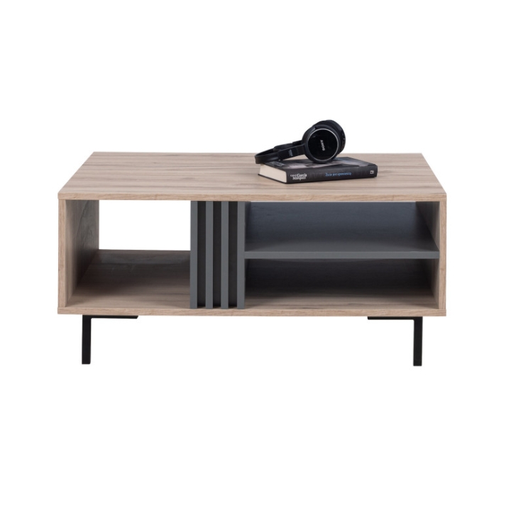 The rectangular top in light oak finish adds warmth and a welcoming touch to the room. Below the top, there’s an open storage area for everyday items and a shelf in anthracite color with a decorative insert, adding visual contrast and helping you keep books, remotes, or magazines neatly organized.