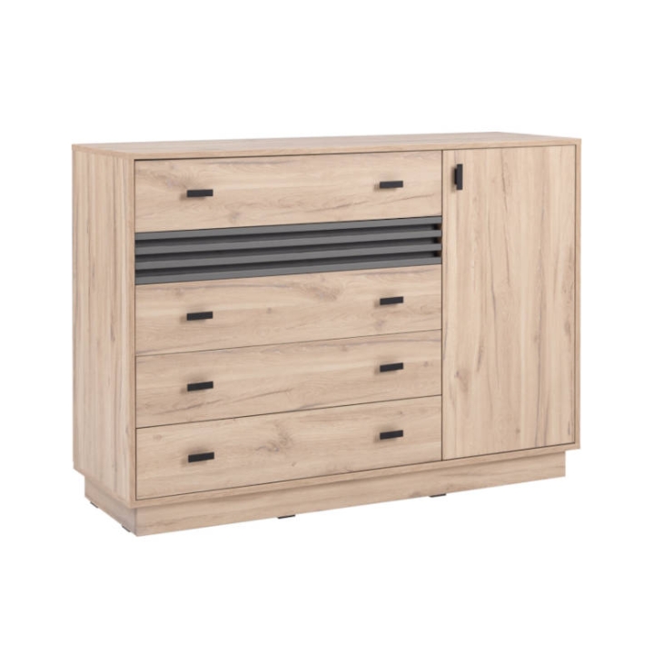 The main section consists of drawers ideal for storing clothes, underwear, documents, or home accessories. There are four drawers in a light oak tone and one smaller drawer with a grooved graphite-colored front, adding a subtle decorative contrast.