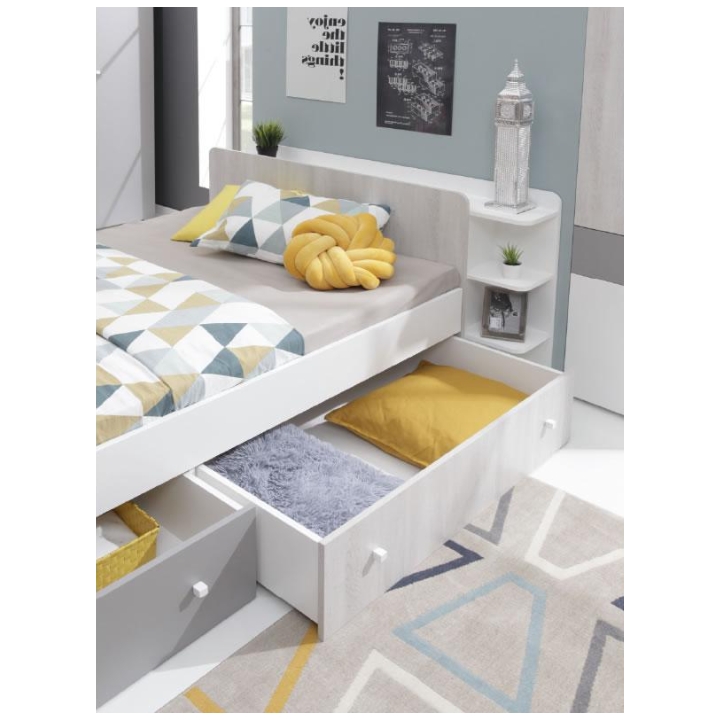 The white body and fronts bring a sense of lightness and freshness to the room. On the right-hand side, there are two spacious drawers – one in grey and one in white – providing additional storage for bedding, clothes, or everyday items. This design makes it easier to maintain order and organize the surrounding space efficiently.