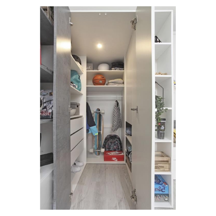 In the left configuration, the open-shelf section and door handle are positioned for convenient access when the door opens to the left. Also available in a right configuration, it can easily adapt to any room setup. The Sigma SI1 wardrobe is ideal for a bedroom, youth room, or home office, offering generous storage capacity and a modern look that complements diverse interior designs.