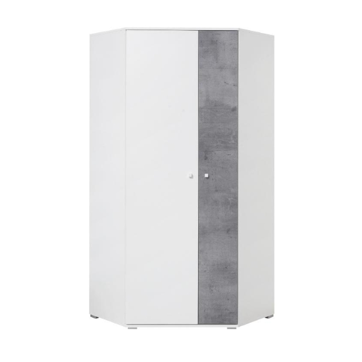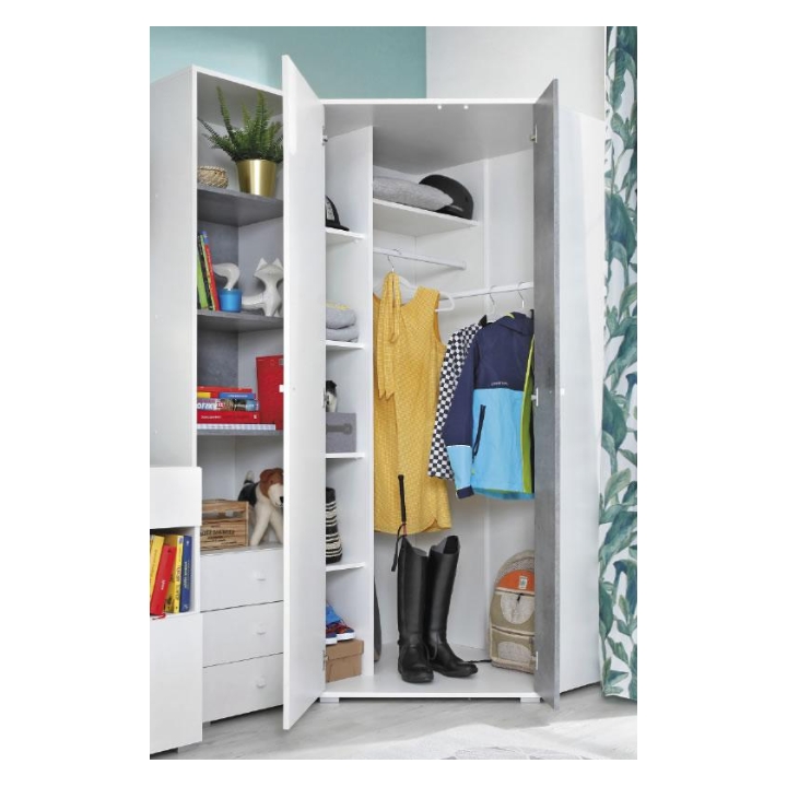 The white body brightens the space and gives it an airy feel, while the white front with a concrete accent introduces a contemporary industrial note. The wardrobe is made of high-quality furniture board, ensuring long-term durability, structural stability, and resistance to everyday use.