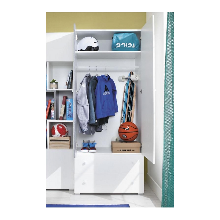 Inside, there is one spacious shelf, a sturdy hanging rail for clothes, and two lower drawers ideal for smaller wardrobe items. This arrangement makes everyday use convenient and intuitive, allowing for easy access to all stored belongings. The elements are positioned to make the most of the available space, which enhances comfort and order in daily routines.