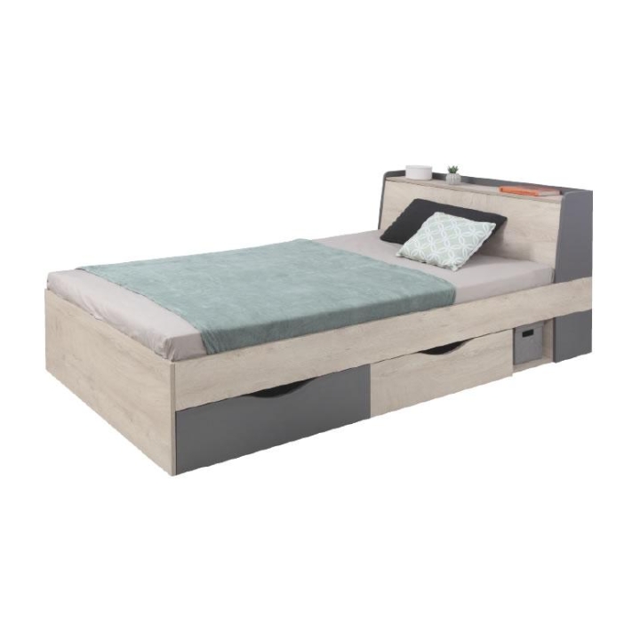 The Meblar Delta DL15 bed - right-side configuration introduces a touch of modern warmth to any teen bedroom with its blend of natural oak tones and anthracite details. With dimensions of 85 cm in height, 124 cm in width, and 230 cm in depth, and a sleeping area of 120 × 200 cm, it provides a comfortable and cozy space for both rest and relaxation.