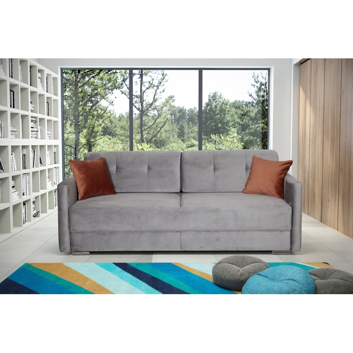 Shelby is a modern and comfortable sofa, which captivates with its simple form. The furniture is also extremely functional, as it is equipped with a sleeping function and a large bedding container. The sofa has been designed in such a way as to ensure the greatest possible comfort of use and to give the feeling of relaxation. The high comfort is mainly due to the seat being filled with high quality HR foam and corrugated springs. This makes the seating surface uniform and soft and springy. Shelby also has a high backrest, which guarantees a suitable place to rest your back against. The backrest is enriched with subtle quilting. The narrow armrests will allow you to save space and position the sofa even in a small room.