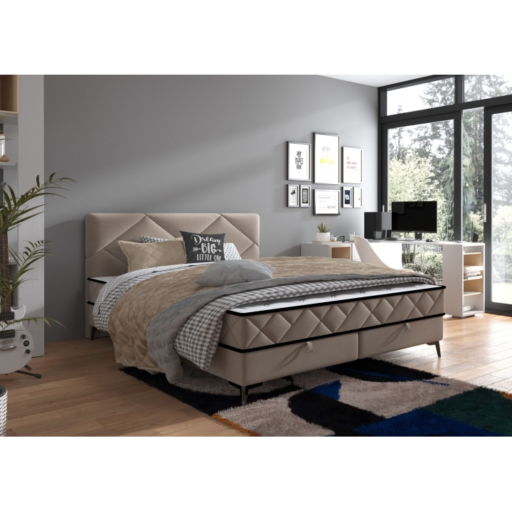 The model is equipped with a bedding container divided into two parts , opened with gas cylinders, which provides easy access to additional storage space. The construction is made of furniture board, which guarantees durability, and the metal legs add to the modern look.