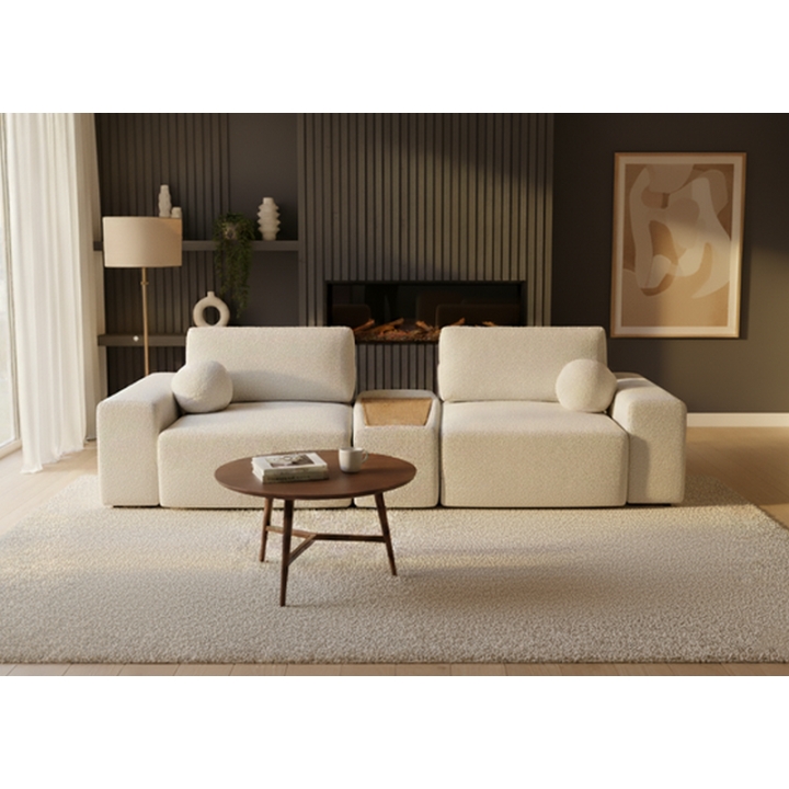 The Morgan 3DL sofa stands out with its unconventional shape and generous dimensions — 298 cm wide at the front, 320 cm at the back, 120 cm deep, and 120 cm high. A signature feature is the integrated central ottoman with a solid wood shelf, which works as a practical surface for drinks, books, or electronic devices, eliminating the need for an extra coffee table.