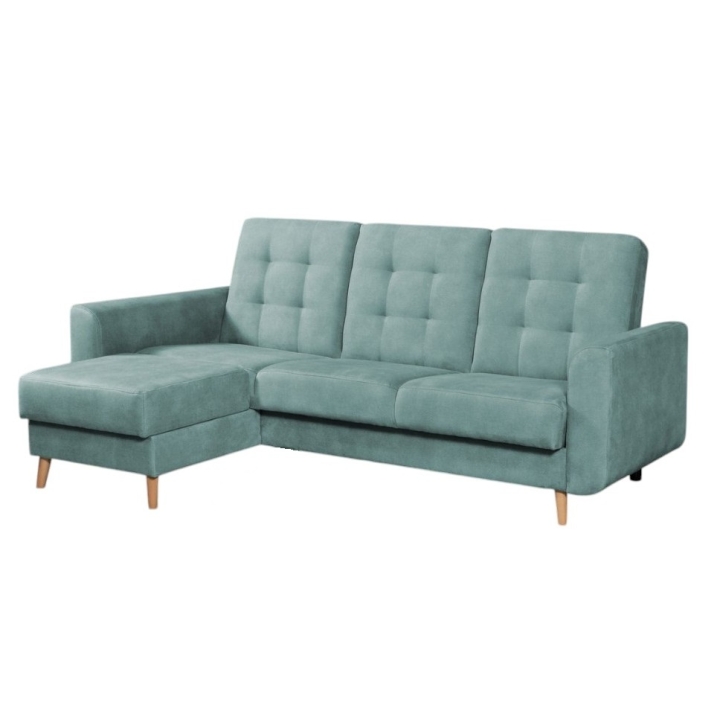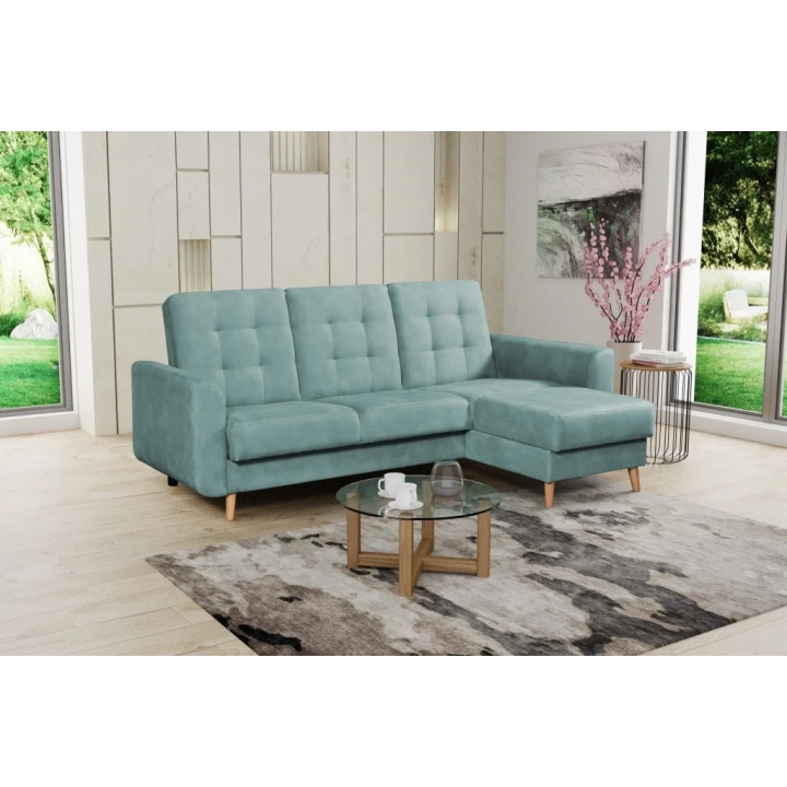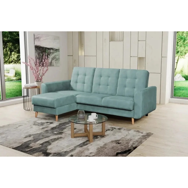 The Impuls corner sofa by Meblosoft is a classic sofa which combines geometric lines, subtle stitching and decorative quilting on the backrest and side. A characteristic element of the model are the wooden legs , which give it lightness and introduce a warm accent to the interior. The furniture is equipped with a click-and-clack sleeping function (sofa bed), as well as a roomy storage compartment for bedding, which makes it ideal also for smaller flats.