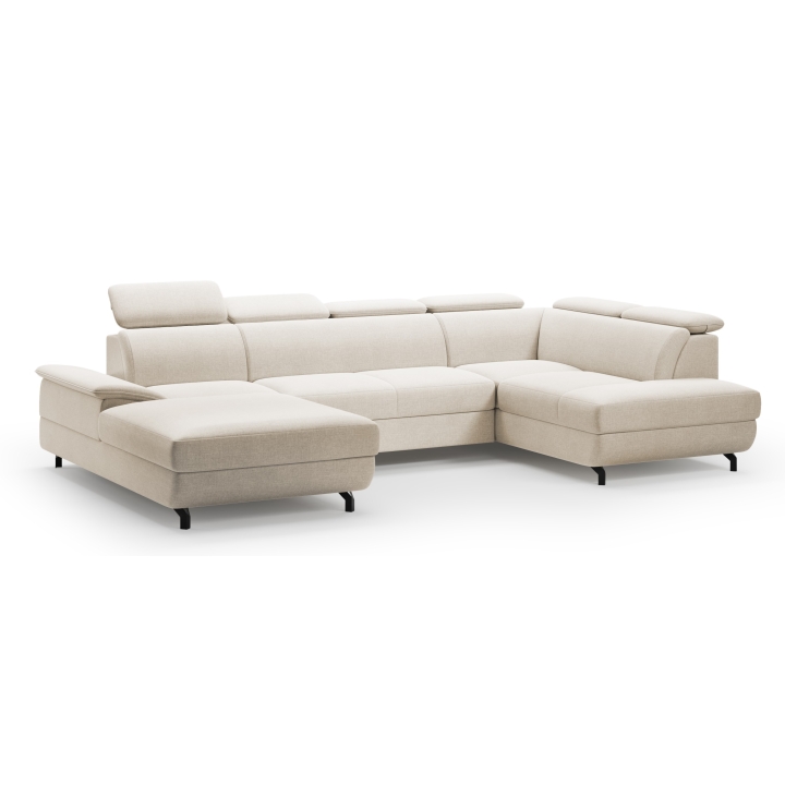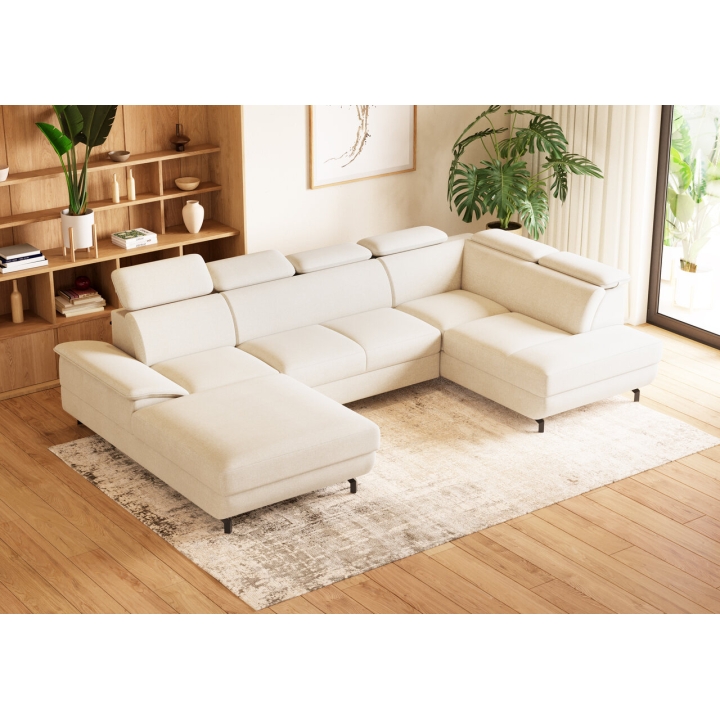 The U-shaped Loft 333x203 corner sofa by MebloSoft is perfectly suited to modern arrangements, becoming the focal point of the lounge space. The expansive body with a width of 333 cm and a depth of 203 cm provides freedom to relax both during the day and in the evening. With a height of 80 to 98 cm and adjustable headrests, it is possible to adjust the position of the backrest to suit individual needs.