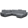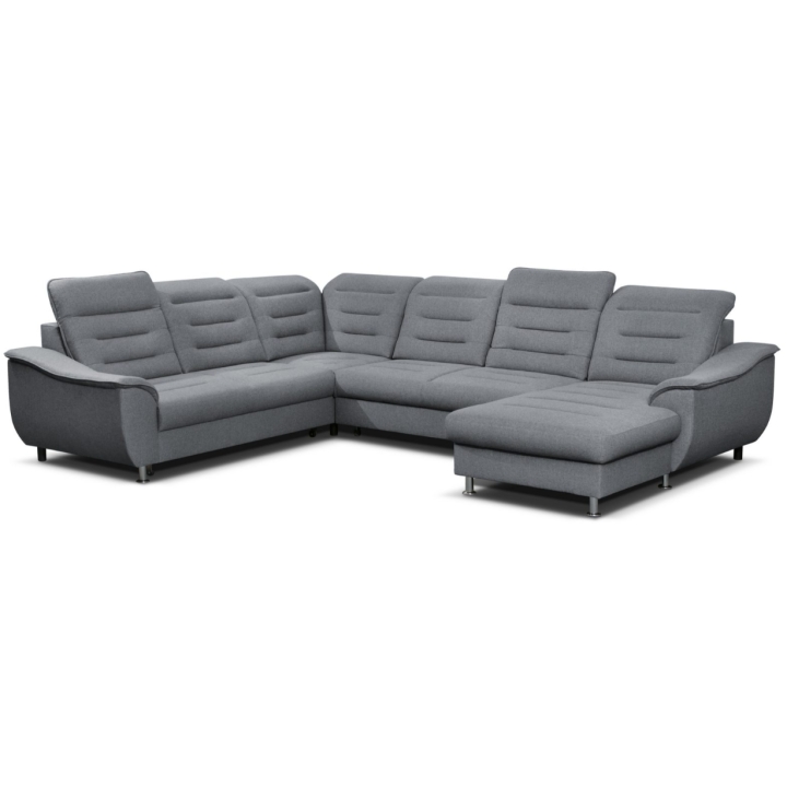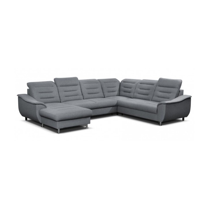 The Bellagio corner sofa from MebloSoft is a spacious U-shaped sofa , providing comfortable relaxation for the whole family. With its large dimensions - 340 cm wide, 93 cm high ( with the possibility of unfolding the headrest to 103 cm) and a depth of 178 cm on the shorter side and 269 cm on the longer side - it offers space for relaxation both during the day and in the evening. It is equipped with a sleeping function with a surface area of 128 x 265 cm, which allows for a comfortable sleep.