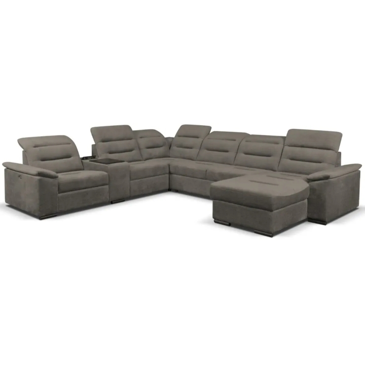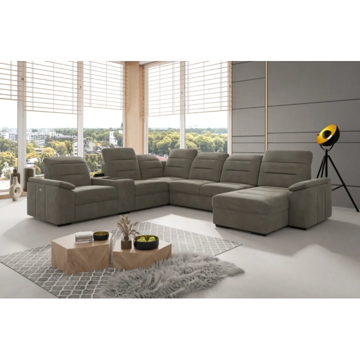 This is a modular corner sofa. It can be optionally equipped with a module with 230V sockets and a USB port for added convenience. The electric relaxation function allows the seat and backrest to be unfolded into a semi-reclining position, further enhancing the comfort of your rest. Please contact our salesperson to arrange this configuration.