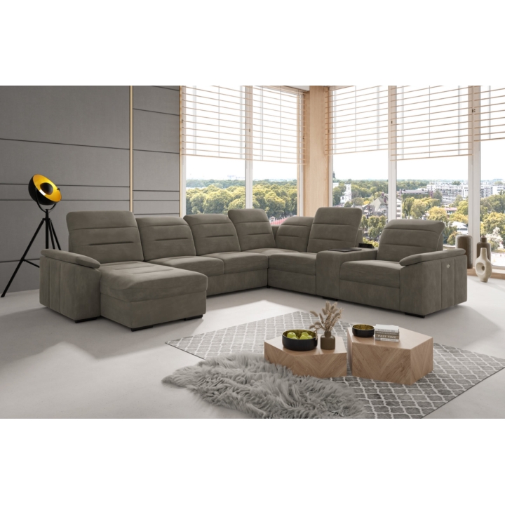 This is a modular corner sofa. It can be optionally equipped with a module with 230V sockets and a USB port for added convenience. The electric relaxation function allows the seat and backrest to be unfolded into a semi-reclining position, further enhancing the comfort of your rest. Please contact our salesperson to arrange this configuration.