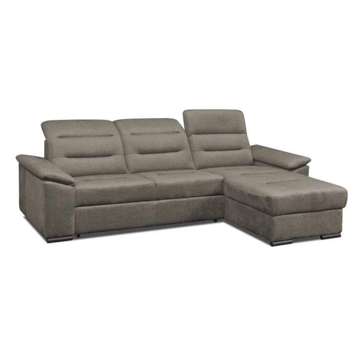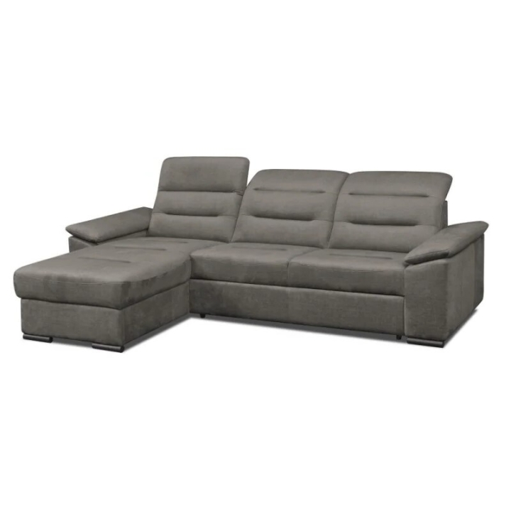 The corner sofa with dolphin sleeping function allows the furniture to be easily unfolded to form a bed with a sleeping surface of 126 × 210 cm, which is also made on a corrugated spring. The integrated bedding container provides a convenient place to store blankets or cushions. The model is available in right- and left-sided versions, making it easy to fit the corner sofa into the interior layout. Upholstered on all sides, it can decorate the living room even standing in the middle of the room.
