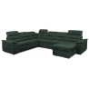 The corner sofa is equipped with a dolphin-type sleeping function and two bedding containers, which makes daily use of the furniture easier. The seat is filled with HR high resilience foam and a corrugated spring to ensure proper springiness and support for the body. The backrest is also made of high quality foam, which contributes to comfort during longer rests. The corner sofa with adjustable headrests and black legs has a modern look and fits into contemporary arrangements. The furniture can be placed in the centre of the living room as it is upholstered entirely in the fabric of the customer's choice.