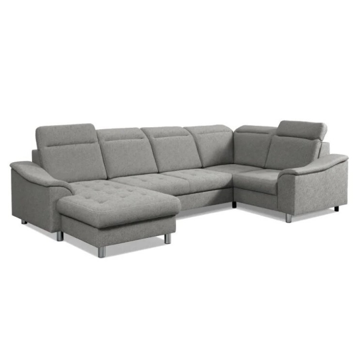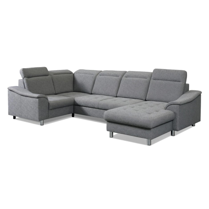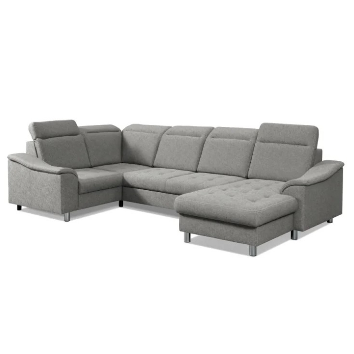 Upholstery is available in a wide range of fabrics, allowing you to match the corner sofa to your own design vision. The model is offered in a left- or right-sided version, which significantly facilitates its arrangement in various room layouts. Subtle quilting and chrome decorative details emphasise its refined form.