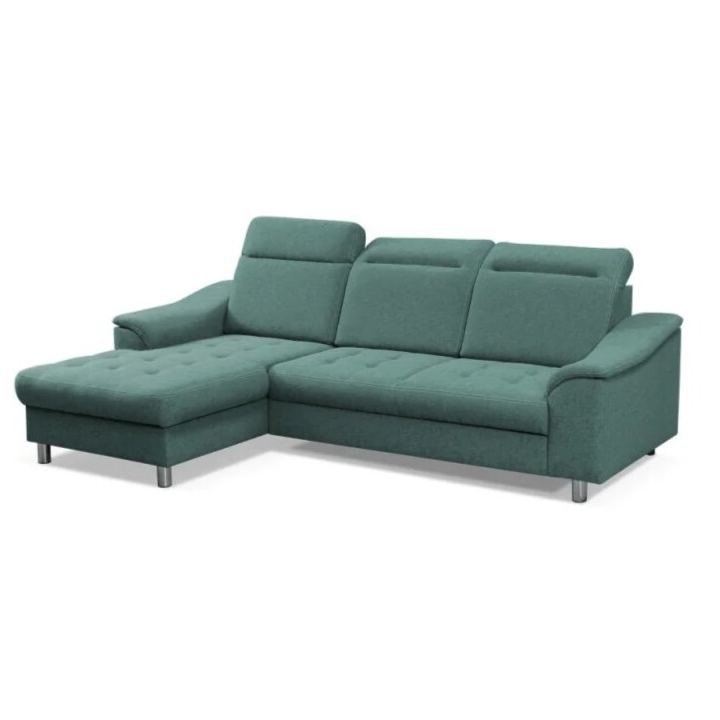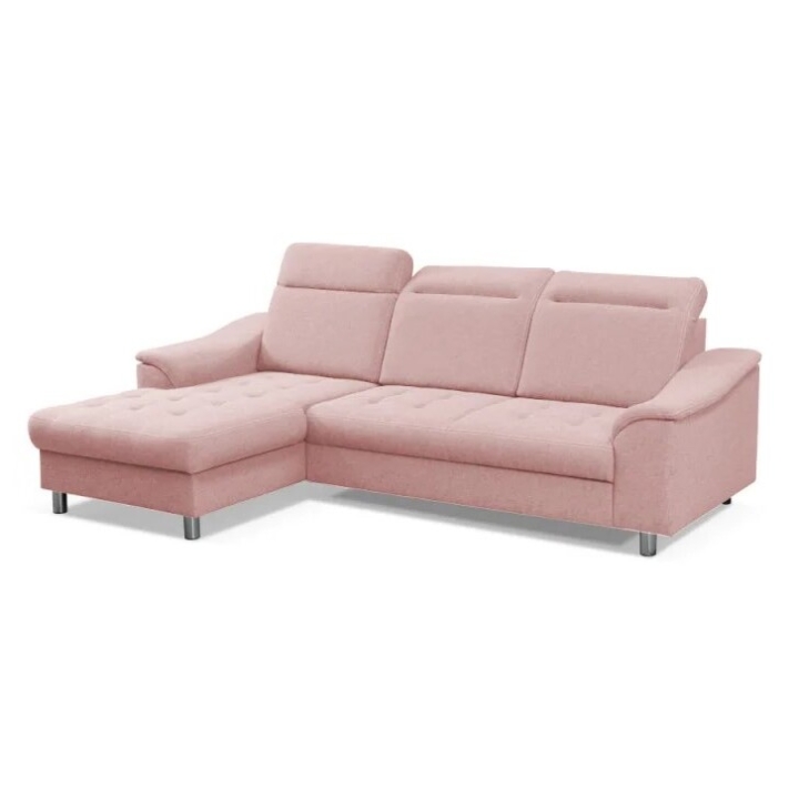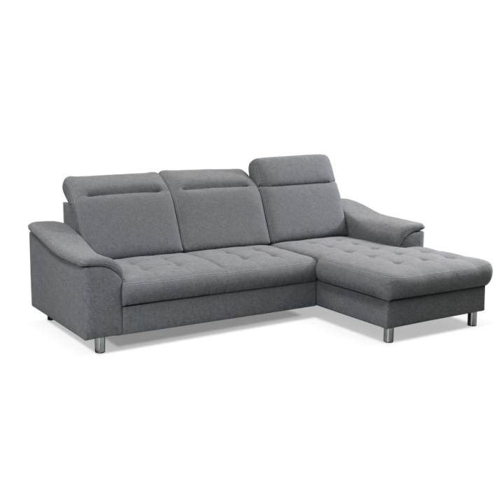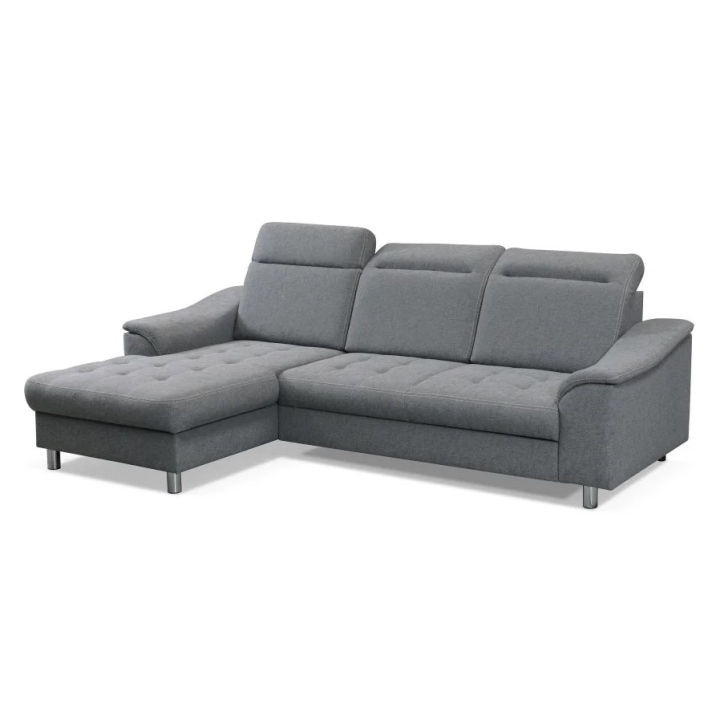 The adjustable headrests allow you to individually adjust the height and angle of the headrest, which promotes a comfortable position for the head and neck. The high backrest and wide armrests add to the overall massiveness and make the corner sofa fill the living room space well. Chrome-plated details in the form of the legs act as a discreet decorative accent.