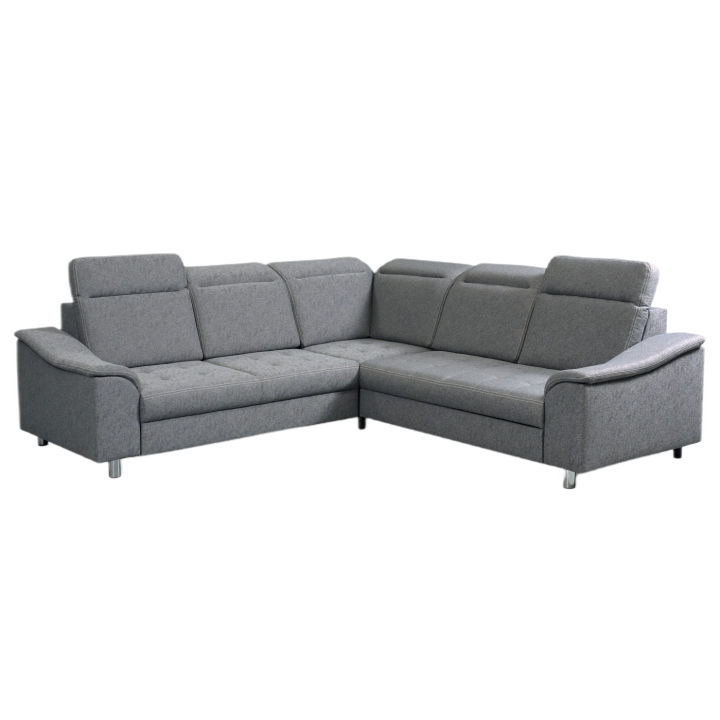 The whole is set on metal legs with a chrome finish, which give the piece a modern expression. The upholstery is available in an extensive palette of fabrics, making it possible to personalise the corner sofa according to individual colour preferences. The carefully crafted quilting introduces a subtle decorative detail, emphasising the carefulness of the finish.