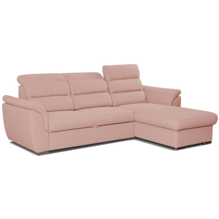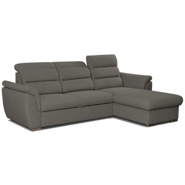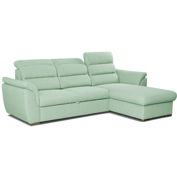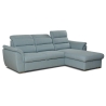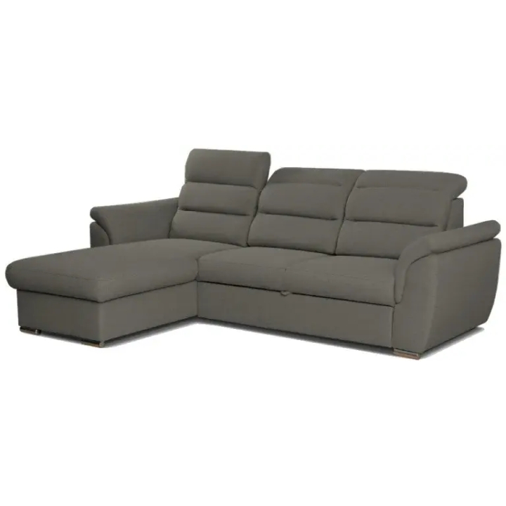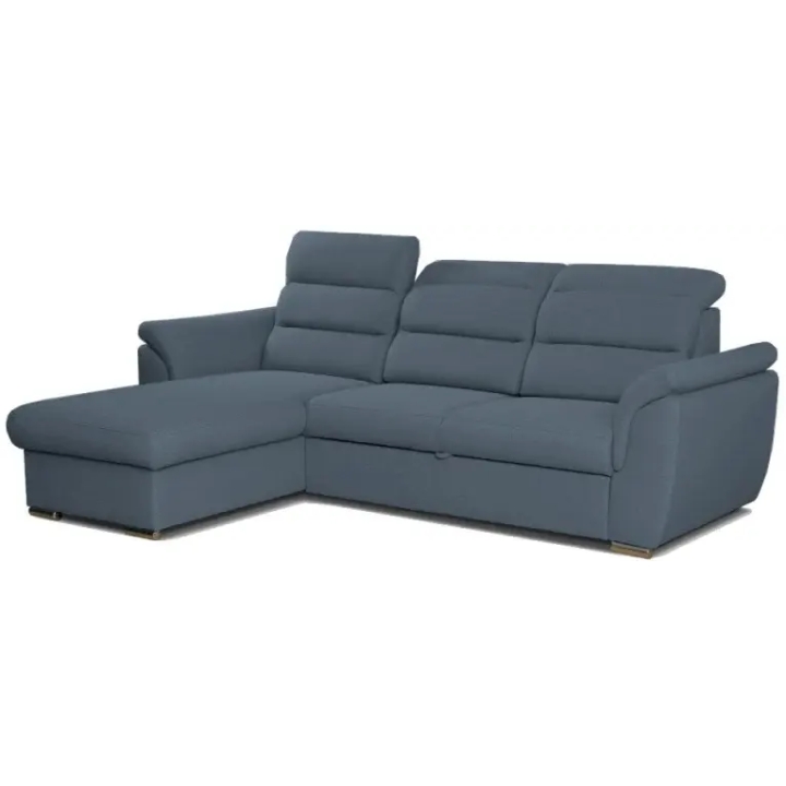 This model is equipped with a dolphin-type sleeping function and a bedding container located in the ottoman. The unfolding function provides a sleeping surface of 196x118 cm, ideal for an occasional night's sleep. The furniture is set on chrome legs that give it lightness and emphasise its modern style.