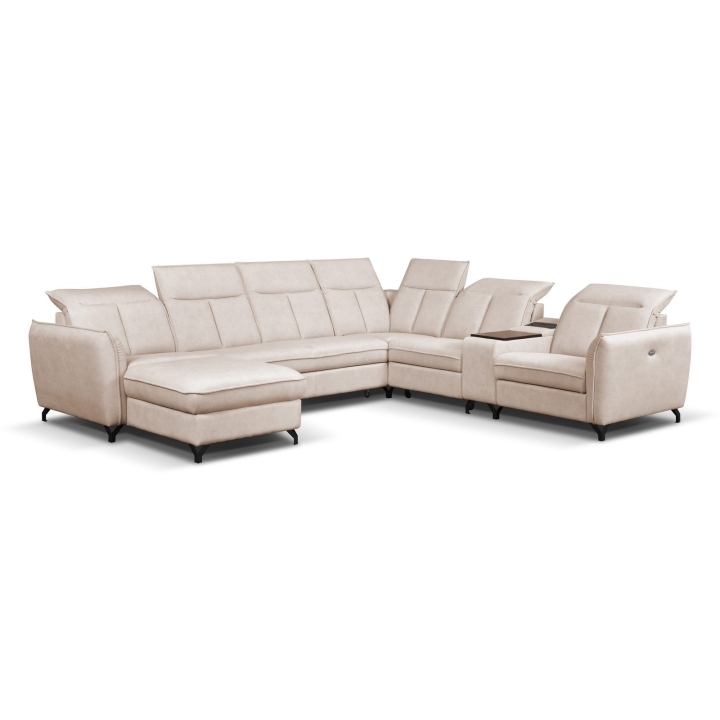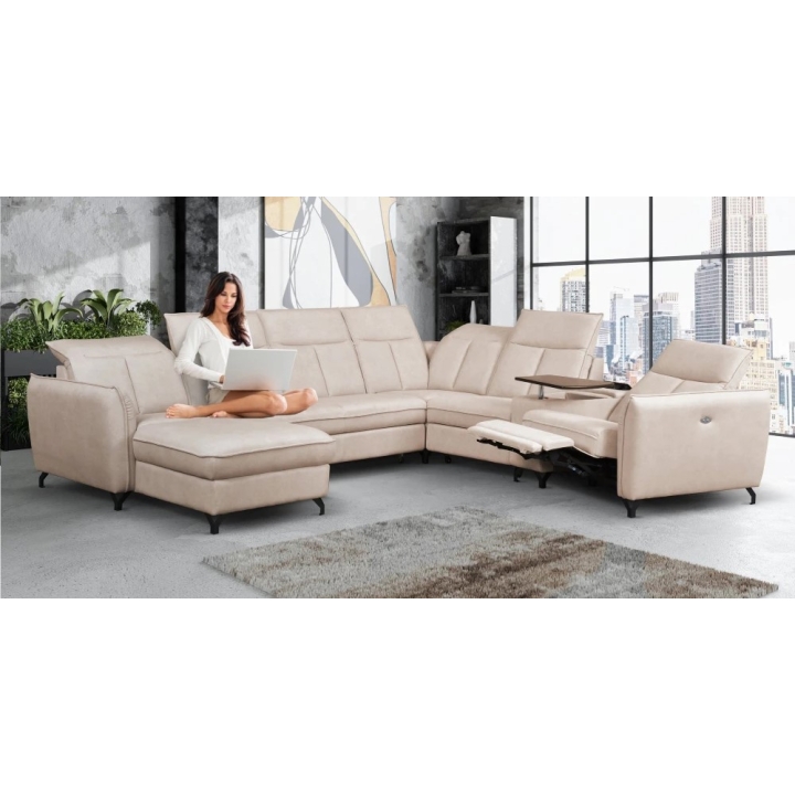 The corner features adjustable headrests and a bar with a module with 230V sockets and USB ports, which provides convenience of use and an additional function of charging devices. The greatest asset is the electric relax function in the armchair, which allows the seat and backrest to be unfolded into a semi-reclining position with the push of a button. The soft HR high-flexible foam seat and corrugated springs guarantee high comfort.