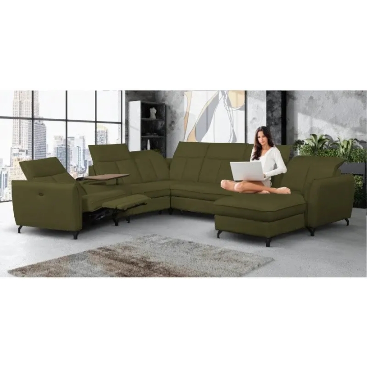 The corner features adjustable headrests and a bar with a module with 230V sockets and USB ports, which provides convenience of use and an additional function of charging devices. The greatest asset is the electric relax function in the armchair, which allows the seat and backrest to be unfolded into a semi-reclining position with the push of a button. The soft HR high-flexible foam seat and corrugated springs guarantee high comfort.