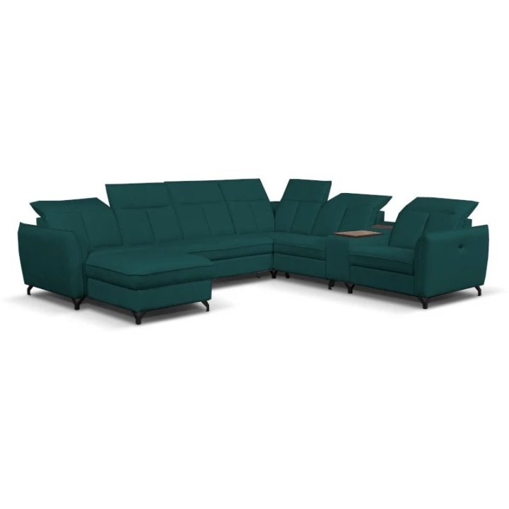 The model has adjustable headrests, high backrest and wide armrests. The sofa is available in a right- and a left-hand version. For an extra charge, it is possible to order a module with a container equipped with 230V sockets and USB ports. The entire set is set on metal legs. The customer has the option of personalisation - a choice of upholstery fabric and corner sofa side configuration.