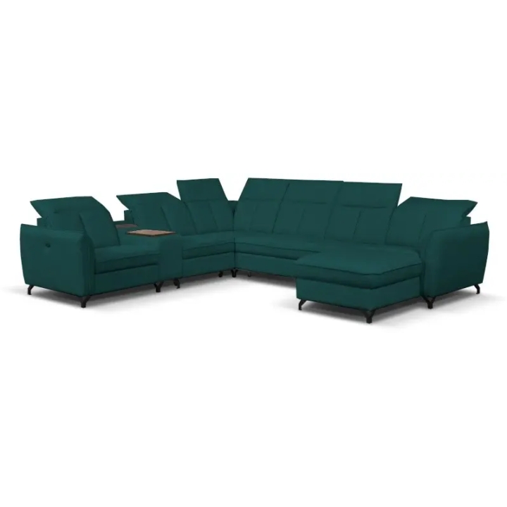 The model has adjustable headrests, high backrest and wide armrests. The sofa is available in a right- and a left-hand version. For an extra charge, it is possible to order a module with a container equipped with 230V sockets and USB ports. The entire set is set on metal legs. The customer has the option of personalisation - a choice of upholstery fabric and corner sofa side configuration.