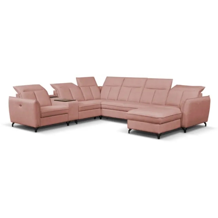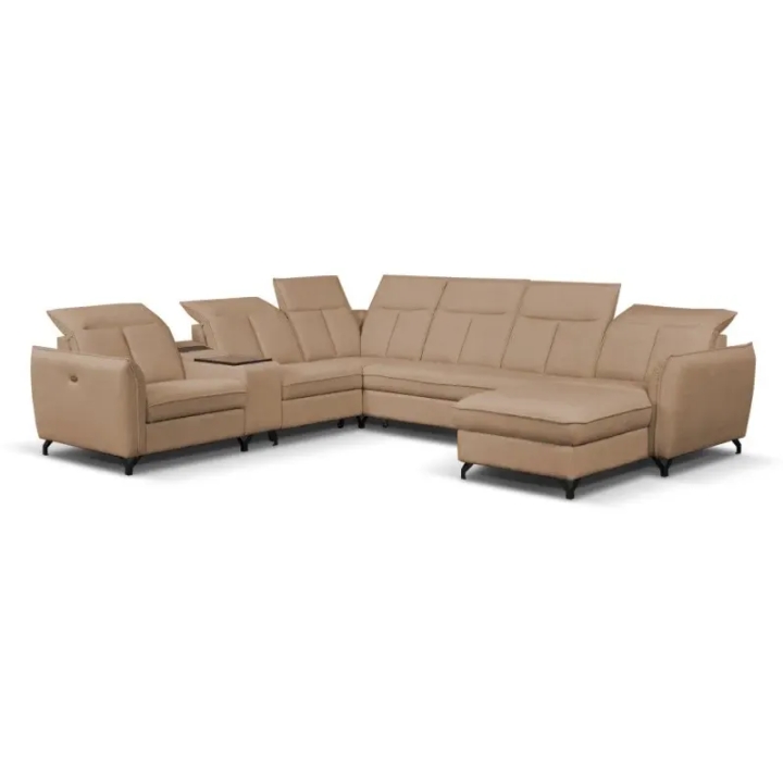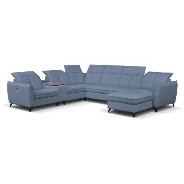 The model has adjustable headrests, high backrest and wide armrests. The sofa is available in a right- and a left-hand version. For an extra charge, it is possible to order a module with a container equipped with 230V sockets and USB ports. The entire set is set on metal legs. The customer has the option of personalisation - a choice of upholstery fabric and corner sofa side configuration.