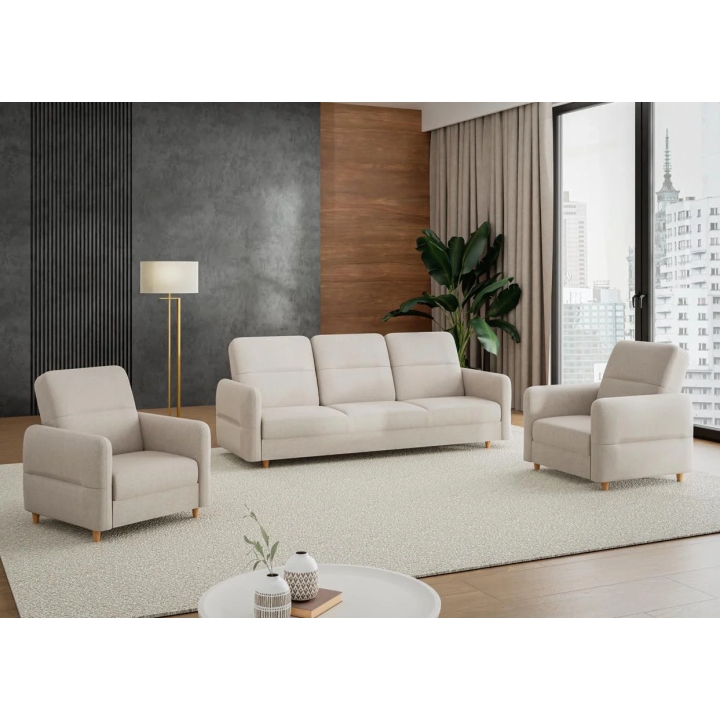 The Dakar sofa by Meblosoft is a three-seater lounge furniture with a sleeping function and a bedding container, which will prove useful in a living room furnished in a modern style. Corrugated springs and HR high resilience foam provide adequate support and softness to the seat, while the slender armrests give the whole a light form. The backrest is decorated with horizontal stitching, giving the piece a subtle geometric touch.