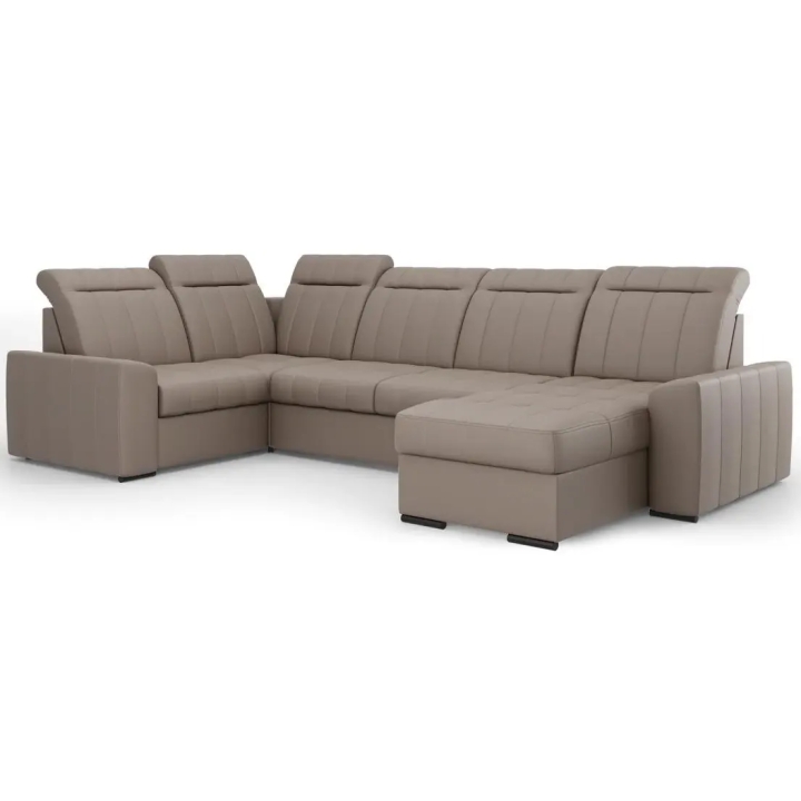 The Marshall OT-2F-R-1 341x199 corner sofa with sleeping function by Meblosoft is a modern piece of lounge furniture that provides comfort for everyday use and additional sleeping space. This model is equipped with a dolphin-type unfolding system and two bedding containers for easy storage of additional textiles within easy reach. The comfort of use is enhanced by the HR high resilience foam filling and corrugated springs in the seat and mattress, and the whole is complemented by adjustable headrests and high backrest.