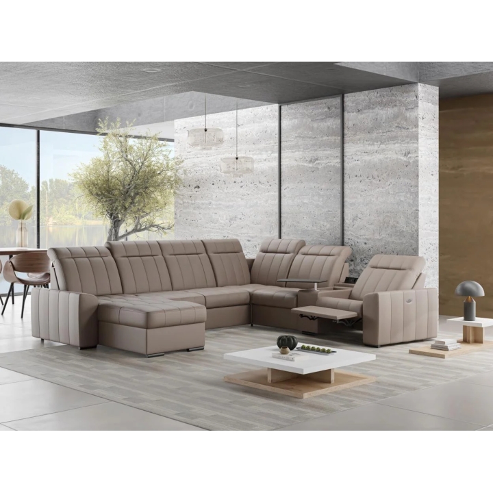 The OT(P)-2F-R-1-BR LUX-1E(L) corner sofa by Marshall Meblosoft is a modern lounge furniture with dimensions of341cm wide, 322cm deep, and 176cm shorter side, 88-98cm high, designed for everyday comfort and functionality. The dolphin-type sleeping function allows you to quickly transform the corner sofa into a comfortable bed measuring 126x270 and the two bedding containers provide storage space for textiles. The expansive modular layout offers plenty of space for seating and comfortable relaxation during the day.