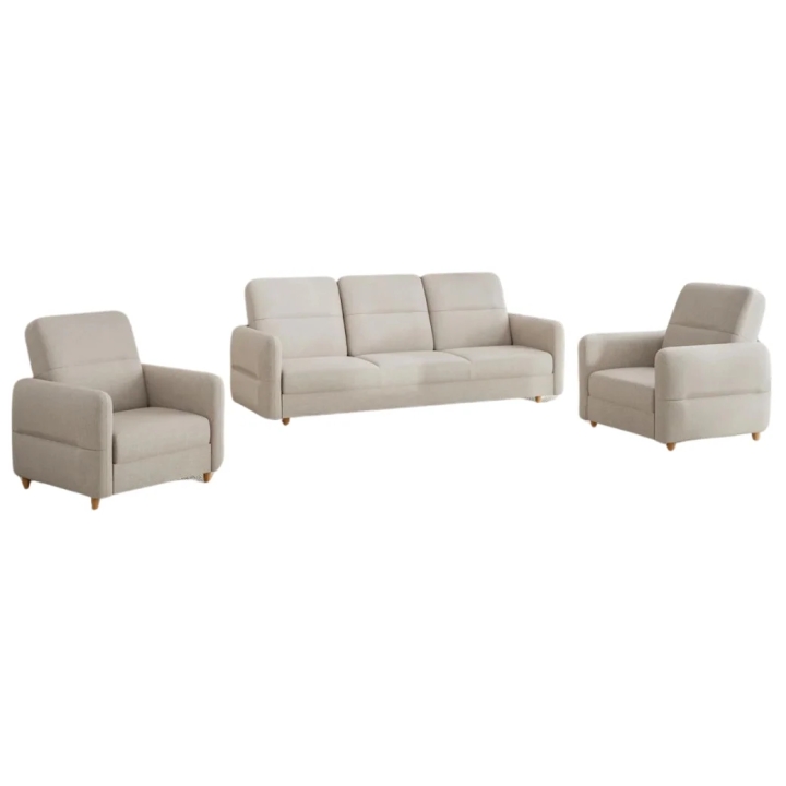 The Dakar sofa set by Meblosoft consists of a three-seater sofa with a sleeping function and two upholstered armchairs, which together create a coherent and modern whole for the living room. The sofa with a sleeping function and a container for bedding is equipped with a click-clack folding mechanism, which allows you to quickly prepare a sleeping surface of 202x121 cm. Dakar armchairs stylistically matched to the sofa provide a comfortable place to sit and relax. The whole set has been set on low wooden legs, which give the furniture its lightness.