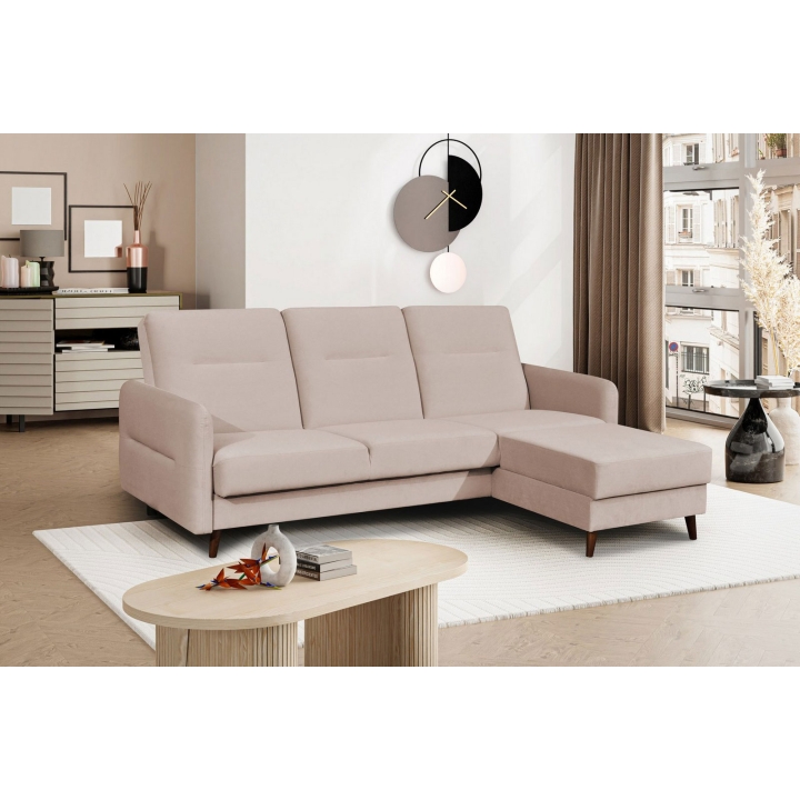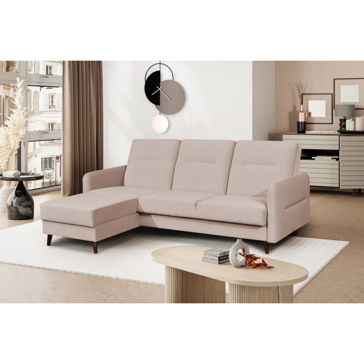 The Dakar corner sofa by Meblosoft is a classic L-shaped upholstered furniture, ideal for everyday relaxation and occasional sleeping. Equipped with a sofa bed function and a bedding container, it allows for easy and quick unfolding. The seat is made on a corrugated spring, ensuring comfort both during the day and at night. The corner sofa measures 225 cm wide, 157 cm deep, 93 cm high and the sleeping area is 202x121 cm.