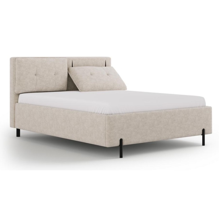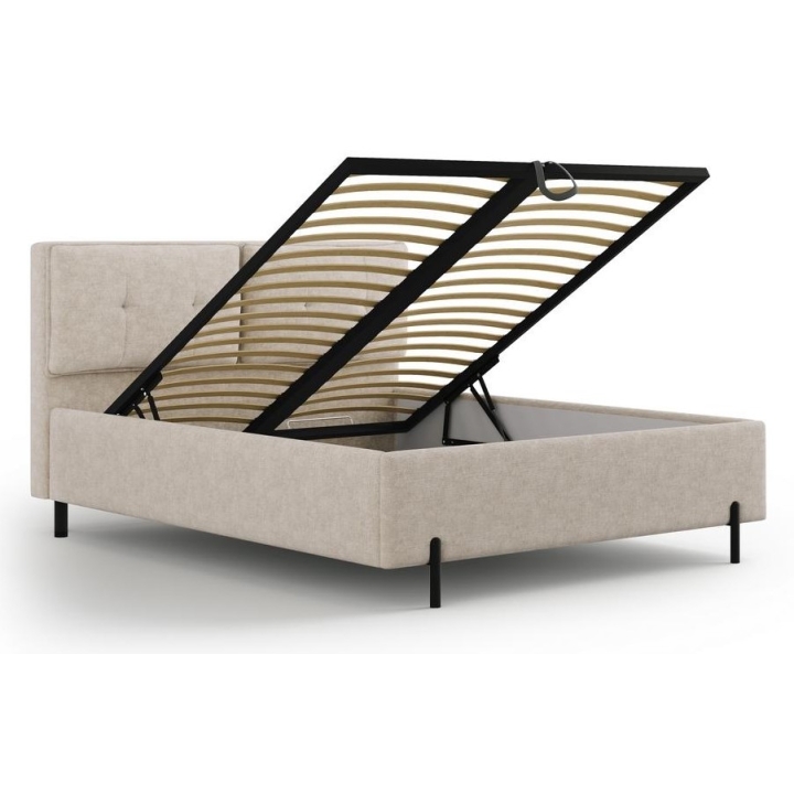 The bed structure is based on a metal frame with a gas lift, under which there is a bedding container occupying the entire space under the mattress. The frame is made of upholstered board and the whole unit stands on high legs, which allows you to easily keep order under the furniture. You can choose the upholstery according to your preferences using the options available in the configurator.