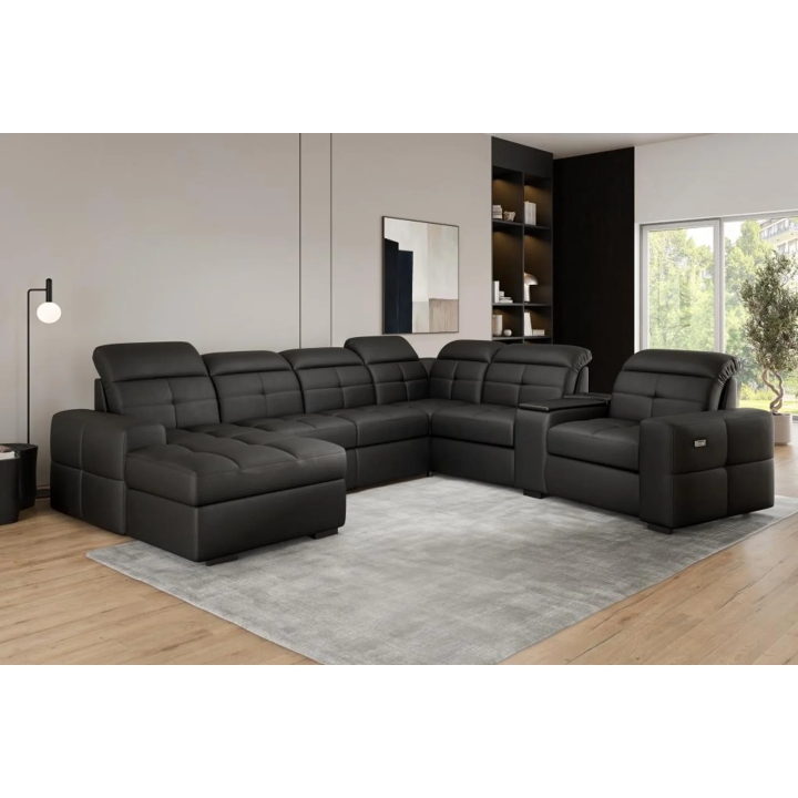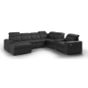 The corner sofa with sleeping function, bar, electric relaxation and containers Kanton Meblosoft is a suitable choice for spacious interiors. Upholstery and fabric colour are available for selection in the configurator. The furniture set on black metal low legs in a cylindrical shape fits in with the modern style.