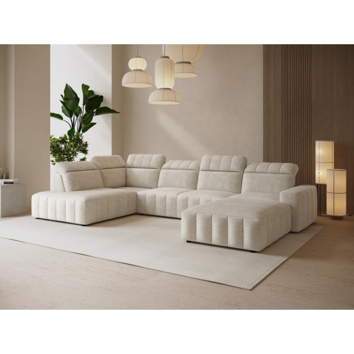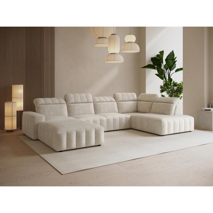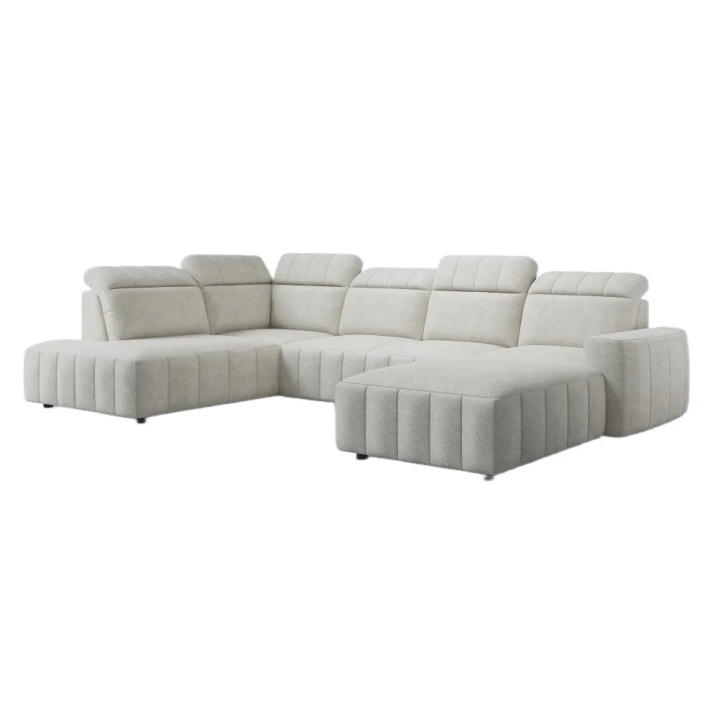 The Montreal corner sofa by Meblosoft has been designed for those looking for a large seating area and comfortable solutions for everyday use. The characteristic U-shape with symmetrical arms and a width of 346 cm with a depth of 199 cm on both sides makes the furniture fill the living room space naturally. The standard height of 88 cm can be increased to 104 cm when the headrests are unfolded. Subtle quilting in the seat part creates a delicate texture, which distinguishes the corner sofa from classic upholstered units.