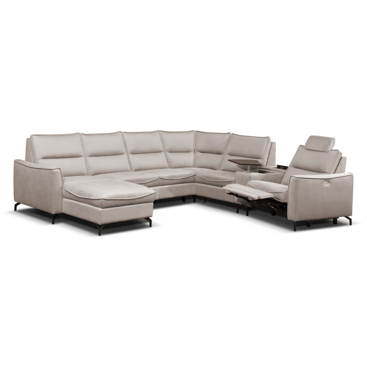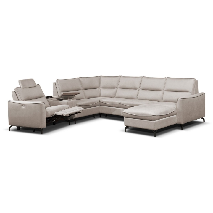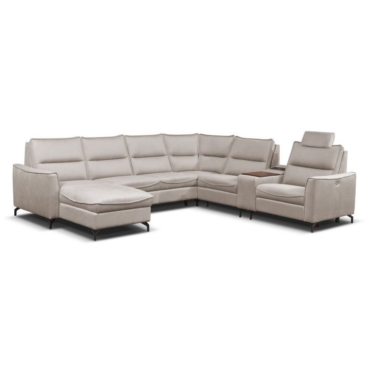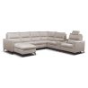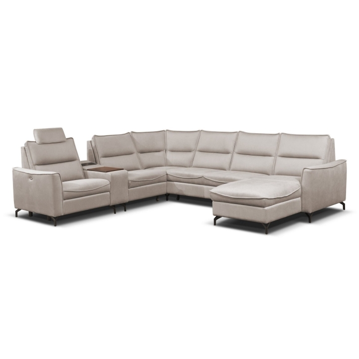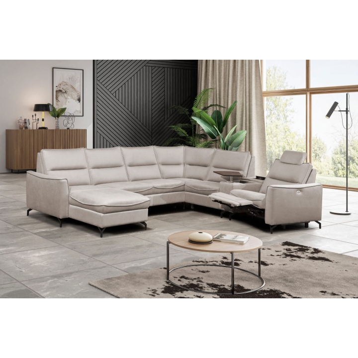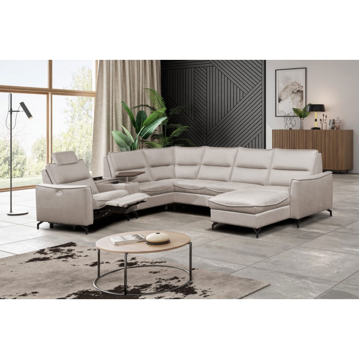 The furniture consists of the following modules: recliner OT(P) with a bedding container, two-seater module with sleeping function 2F, R (corner) module, 1- module with a container, BR LUX bar que and 1E(L) armchair module with electric relaxation and headrest. The design of the corner sofa also makes it possible to create other configurations from elements of the Cristal collection, available in different widths, with manual or electric relaxation, with or without a sleeping function. To create a new configuration, please contact our customer advisor.