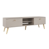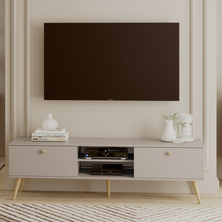 The wide top, 170 cm long, can easily hold a TV up to 70 inches. An additional leg in the middle strengthens the structure and ensures that the cabinet remains stable regardless of the load. The whole is supported by five solid beech wood legs, which blend well with the matte finish of the board. String handles add originality and subtly emphasize the boho character of the furniture.