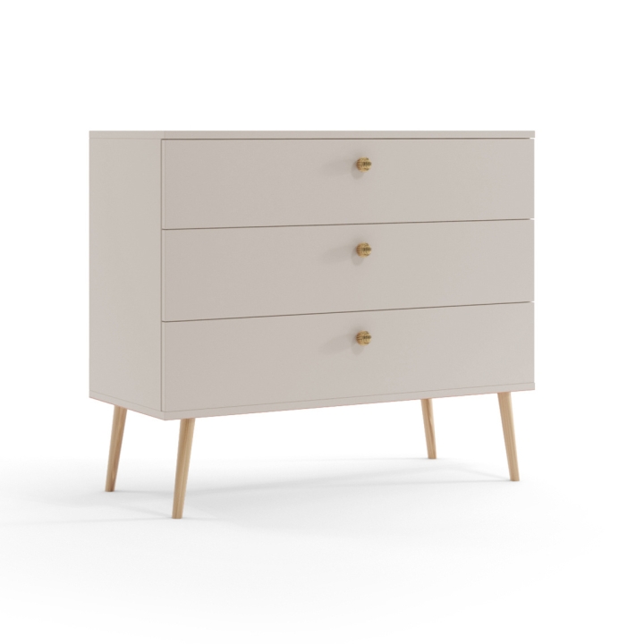 The wooden legs are fixed solidly, which ensures that the piece of furniture will remain stable even when moved frequently. Thanks to its universal dimensions, the chest of drawers will work well in a variety of rooms, and its natural style is easy to juxtapose with other furniture from the collection. It is a combination of simplicity and expressive details that gives the interior a unique character.