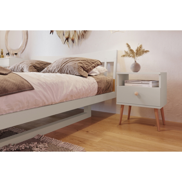 Boho bedside table is a piece of furniture that brings a pleasant atmosphere to the bedroom and gives it a unique character. The slender form, based on high solid wood legs, makes the table look light and subtle, even in small rooms. Thanks to the well-chosen proportions, it fits well in both larger bedrooms and more intimate rooms.