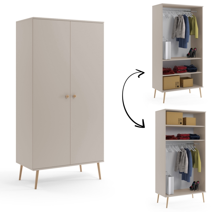 The interior of the closet has been designed to store various closet items. Two shelves and a hanger bar allow you to conveniently separate clothes - from folded sweaters and shirts to long coats and dresses. It is possible to assemble the closet in an alternative configuration: with two shelves in the lower part and a bar placed at the top. This solution gives you more freedom in organizing the interior.