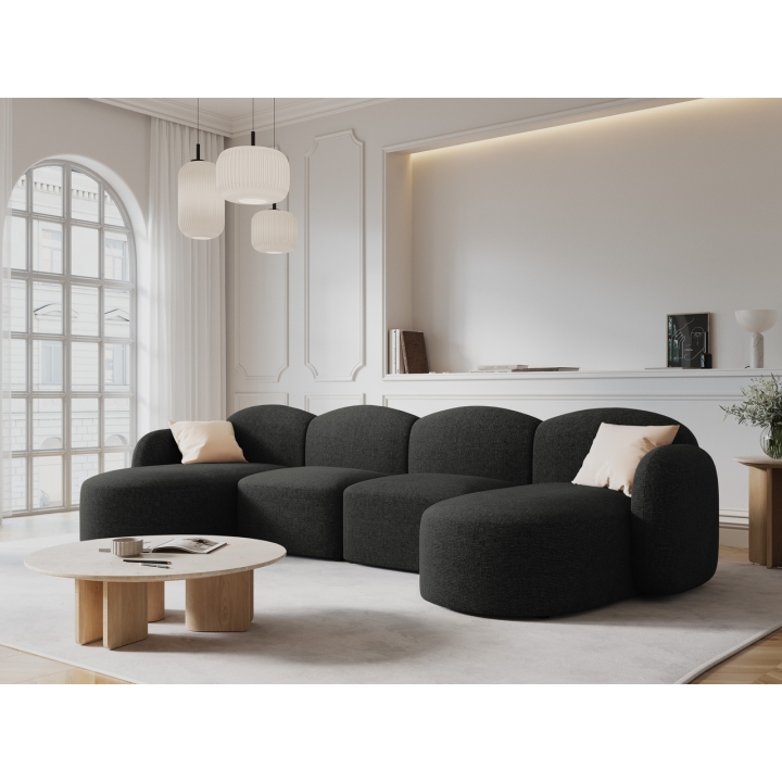 The Blair chenille 6-seater panoramic corner sofa by Micadoni is the ideal solution for lovers of minimalist design combined with a rounded form. Its spacious design measuring 354cm long, 167cm wide on both sides and 76cm high is perfect for spacious living rooms. The deep 65cm seat with a height of 42cm and a width of 150cm ensures comfort during everyday use. The chaise longue, 75cm wide and 167cm long, will allow you to watch TV comfortably even when lying down. The corner sofa is upholstered in high quality Legacy chenille fabric with a distinct weave structure, which is characterised by a silky texture, slightly iridescent surface and durability of 50,000 Martindale cycles.