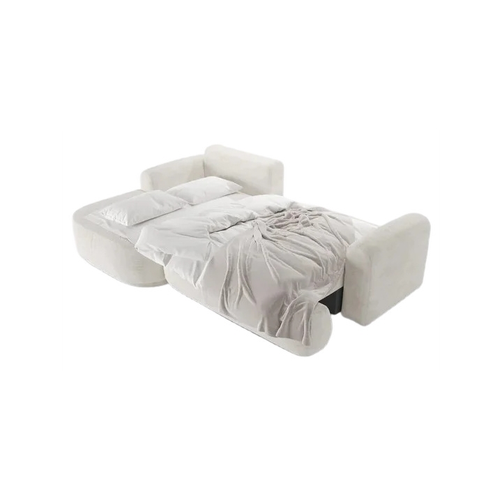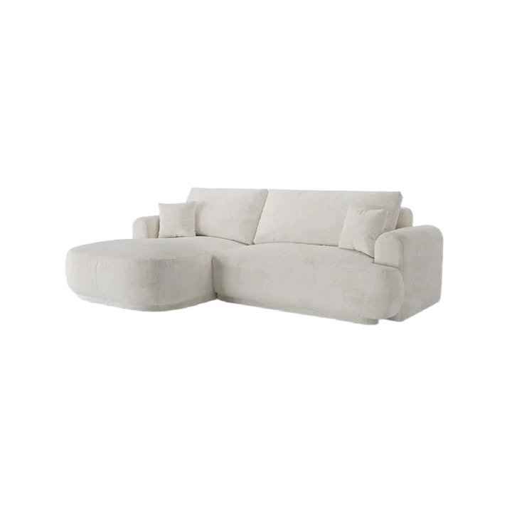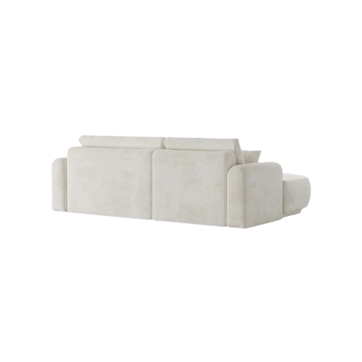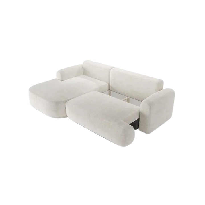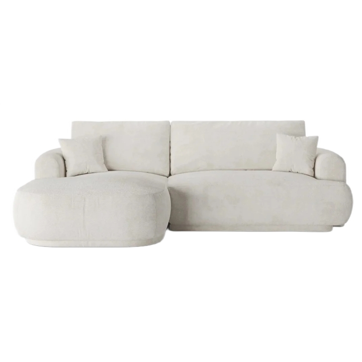 The Ella bukla corner sofa from Micadoni is a retro-inspired folding model that offers both comfort and versatility. With its spacious seat, it provides comfortable seating for five people, while the built-in storage compartment allows you to store bedding and other accessories. When unfolded, the sleeping surface is 131 × 213 cm, making the furniture also suitable as an extra bed.