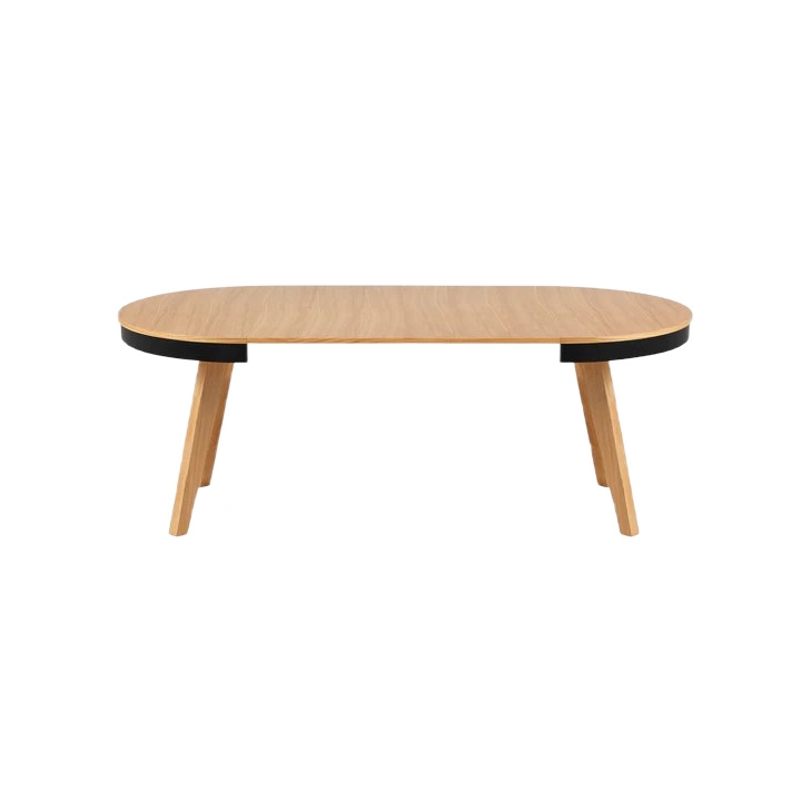 The structure rests on four sturdy wood legs 66 cm high, which provide solid support. The veneered tabletop surface is distinguished by the natural oak grain pattern. An additional accent is the black strip placed under the tabletop, which introduces a striking contrast, especially in the lighter finish variants, giving the furniture a modern and balanced look.