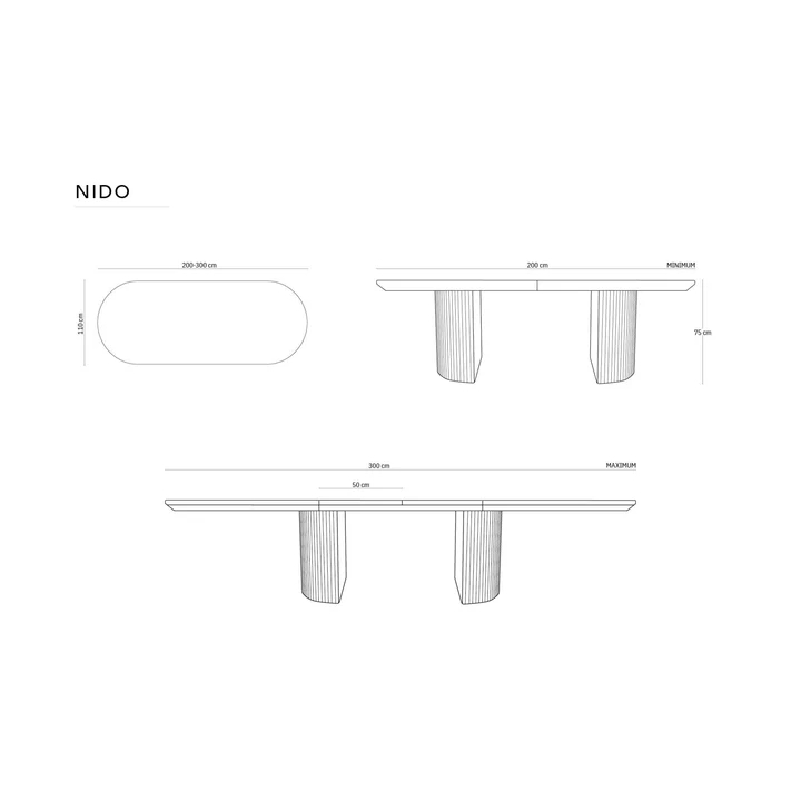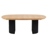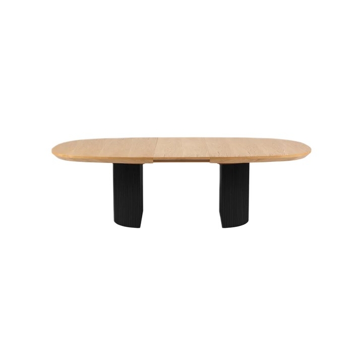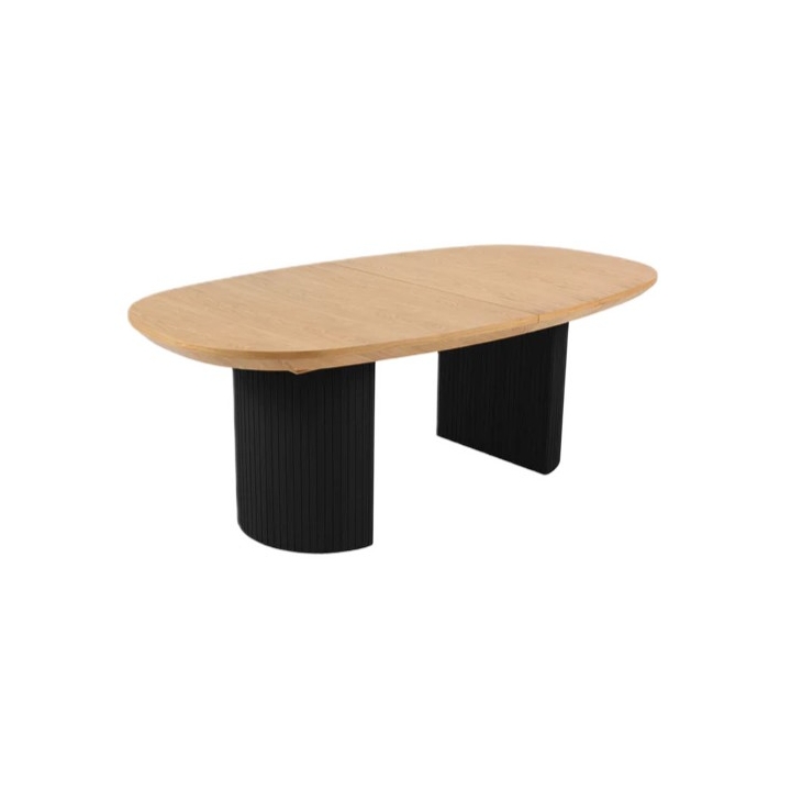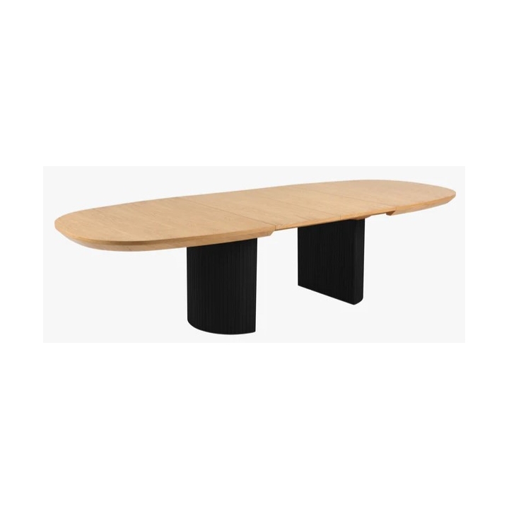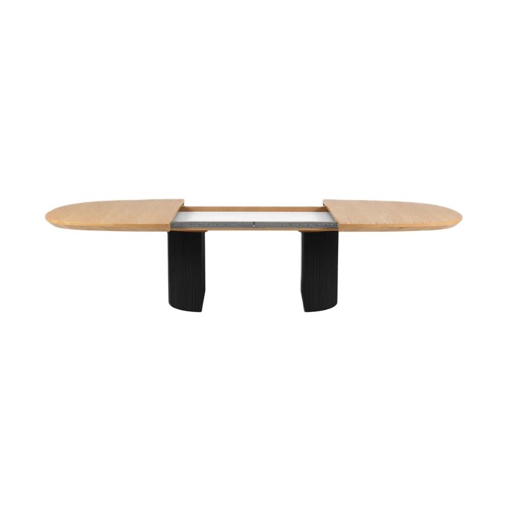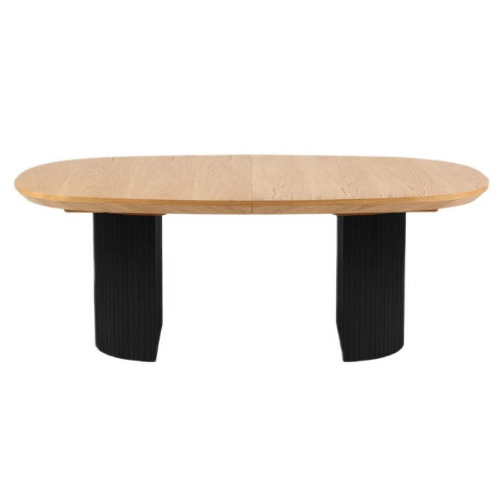 The 200 cm wide table top when unfolded reaches a length of 300 cm, thanks to the use of two additional inserts, each 50 cm wide. The height of the table is 75 cm, which ensures that it can be used comfortably with both classic chairs and dining chairs. The table is maintained in a contrasting colour scheme - the natural oak veneer top is set on black semi-circular legs with decorative grooves. The structure of the table has been designed to ensure stability and comfort in any configuration.