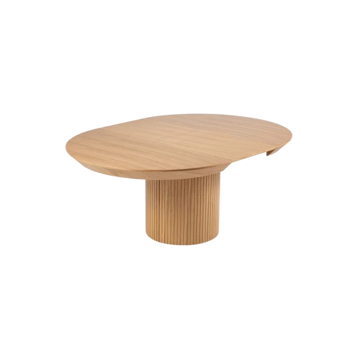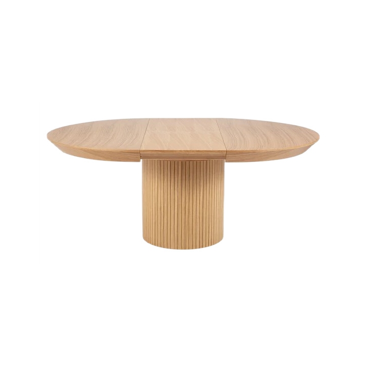 The Nicole folding table from Micadoni is a unique piece of dining furniture that stands out for its original design. The round table top with a diameter of 130 cm can be extended to 180 cm, giving it an elliptical shape. The structure is based on a single solid column-like leg, whose vertical milling adds lightness.