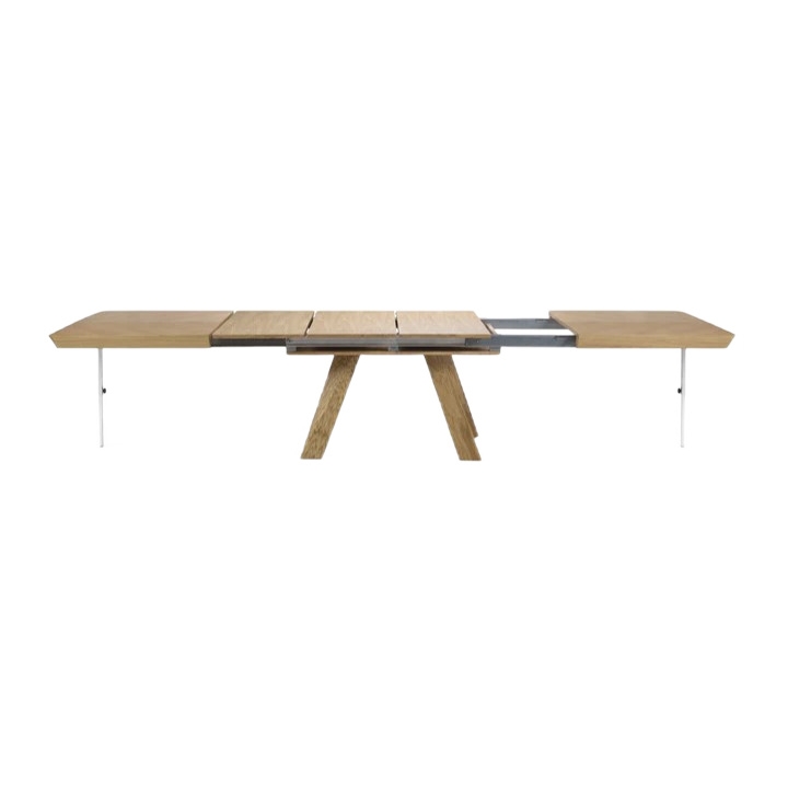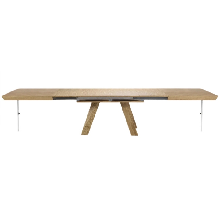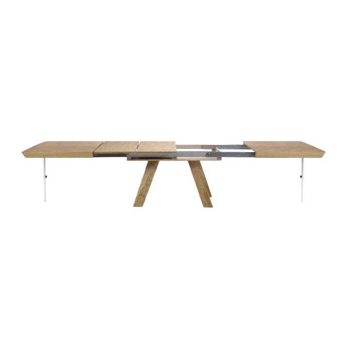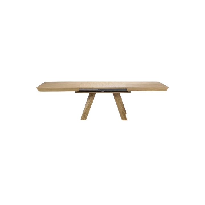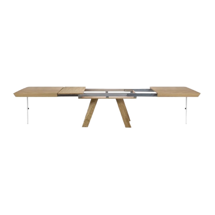 The oak veneered top is distinguished by its wide, chamfered edge and subtly rounded corners, making it look light despite its size. It conceals two pairs of inserts and a rail mechanism for smooth extension. The structure has been equipped with high-quality runners, which guarantees comfortable use.