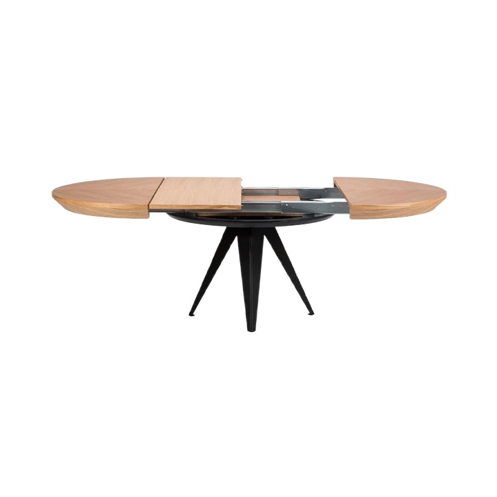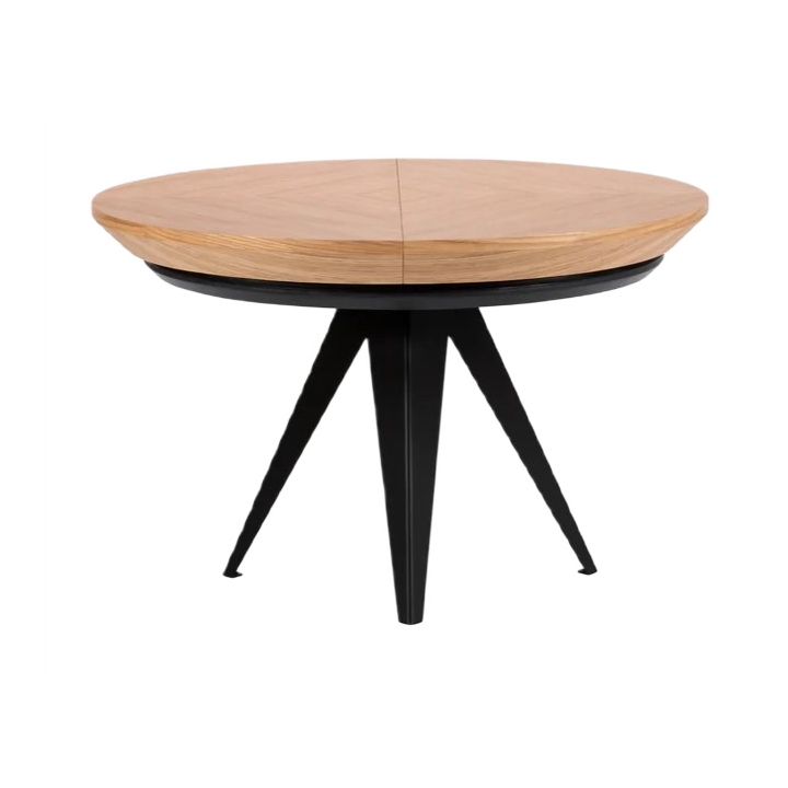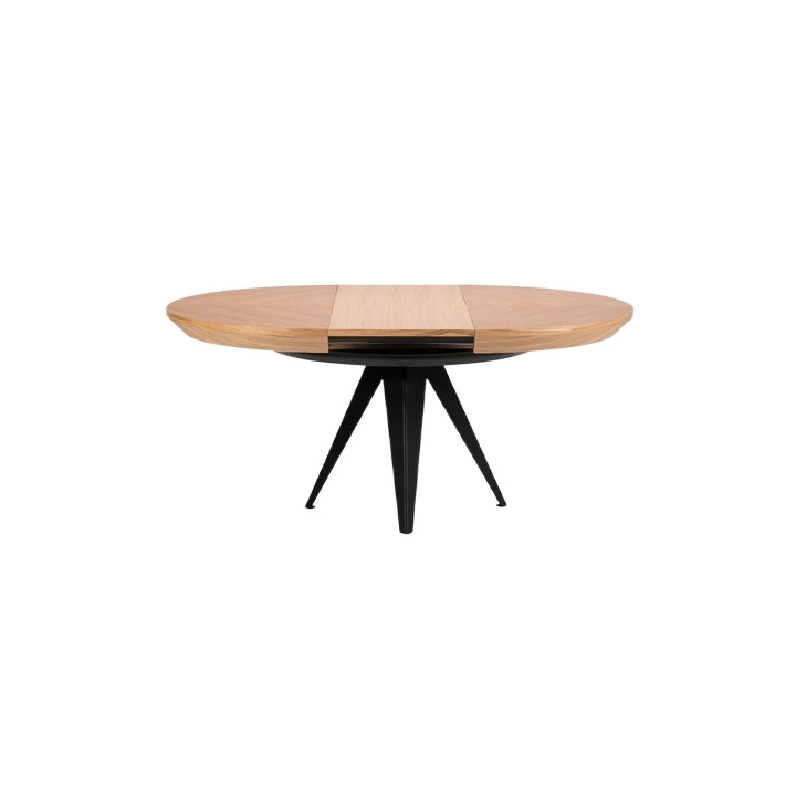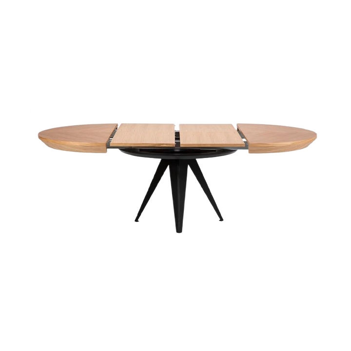 The Toni round table by Micadoni is a proposal for the dining room that combines natural materials with modern design. With a diameter of 120 cm, the table top can be extended to 220 cm, changing its shape into an elliptical one. The structure rests on a black metal base with a distinctive arrangement of legs that provide stability and give the whole an original look.