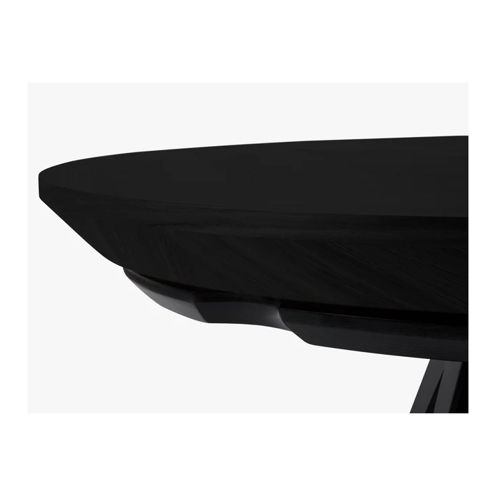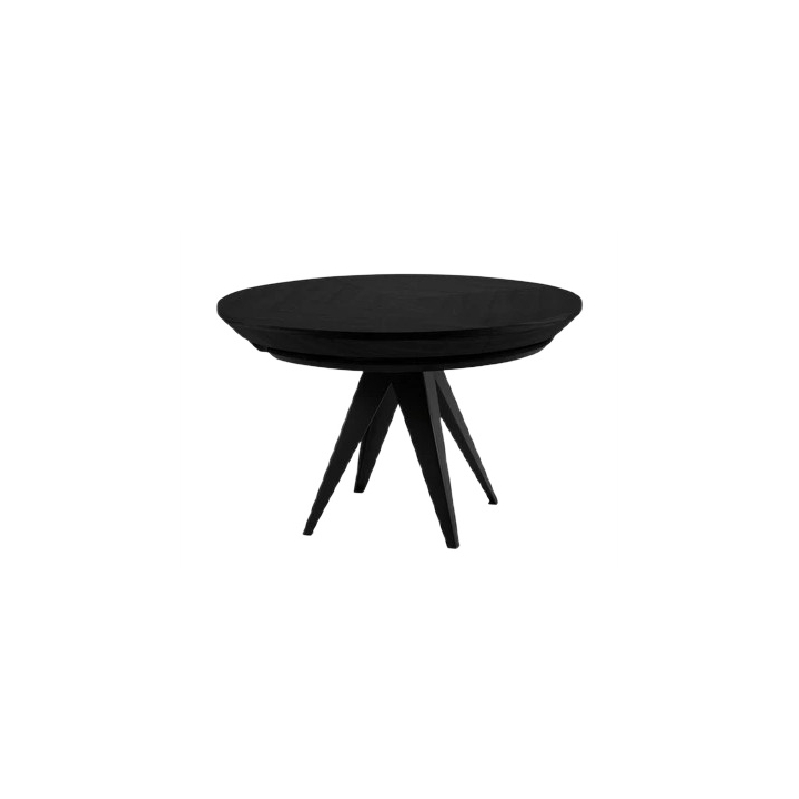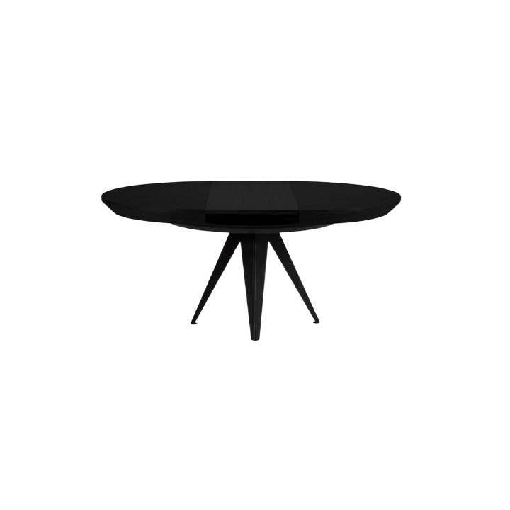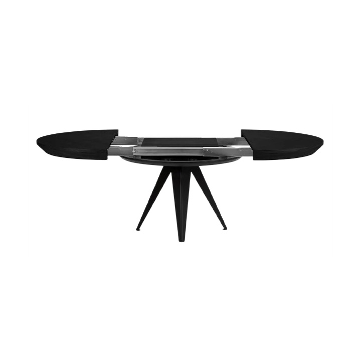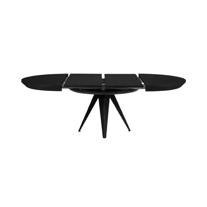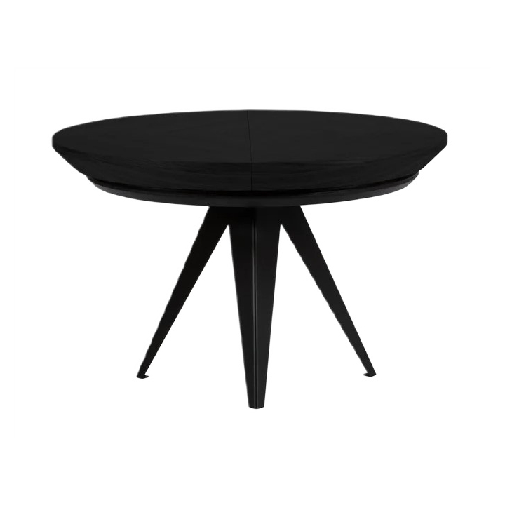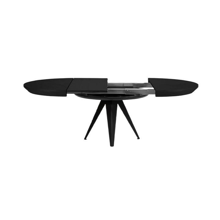The Toni round table by Micadoni is a proposal for the dining room that combines natural materials with modern design. With a diameter of 120 cm, the table top can be extended to 220 cm, changing its shape into an elliptical one. The structure rests on a black metal base with a distinctive arrangement of legs that provide stability and give the whole an original look.