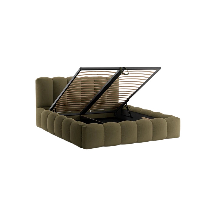 The upholstered bed with storage includes a sturdy slatted frame with elastic slats, providing proper support and ventilation for the mattress.